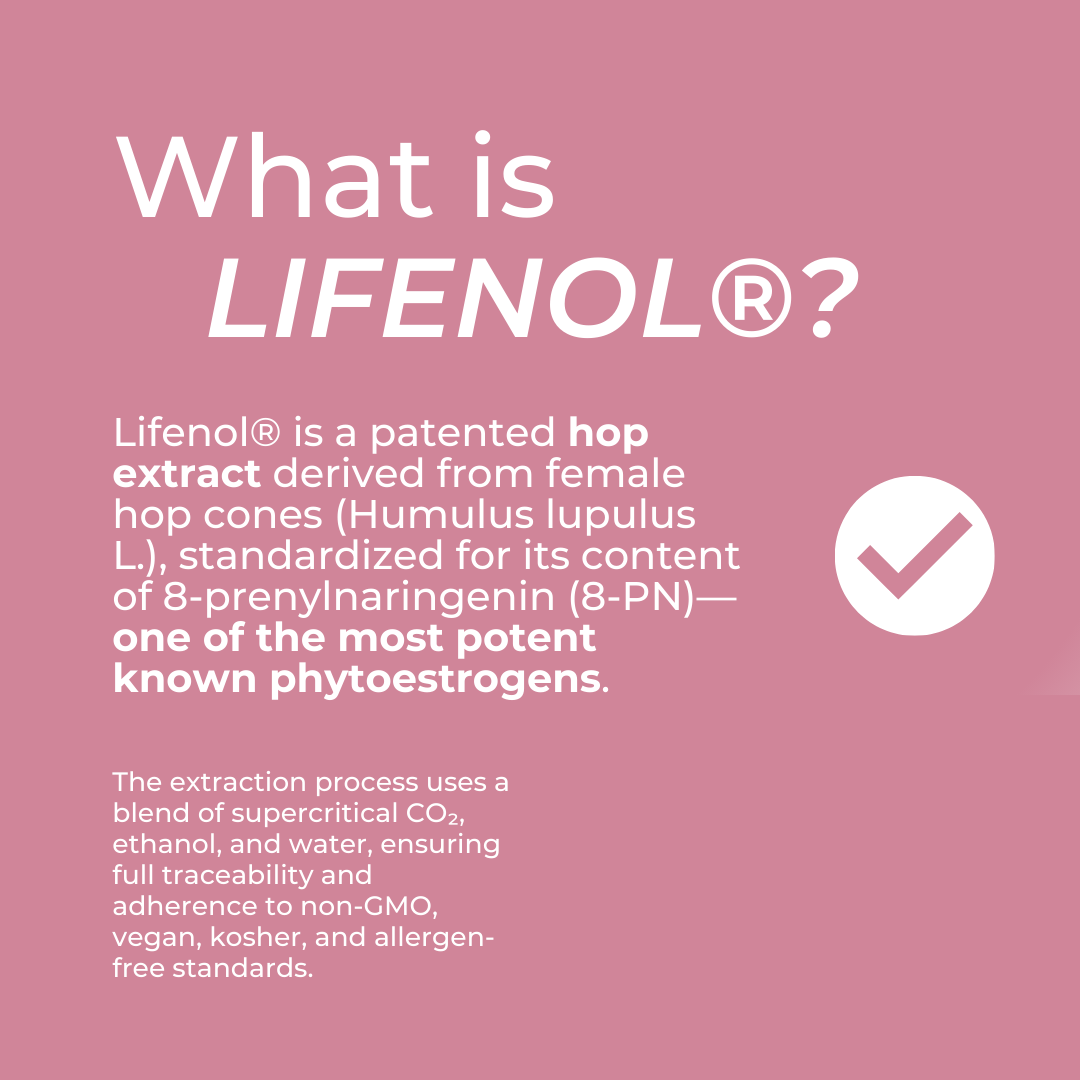 If you're navigating hormonal changes and looking for a natural way to feel more like yourself again, Lifenol could be just what you need. Each capsule delivers a powerful 85mg dose of hops extract, helping you stay balanced, calm, and well-rested throughout the day and night.