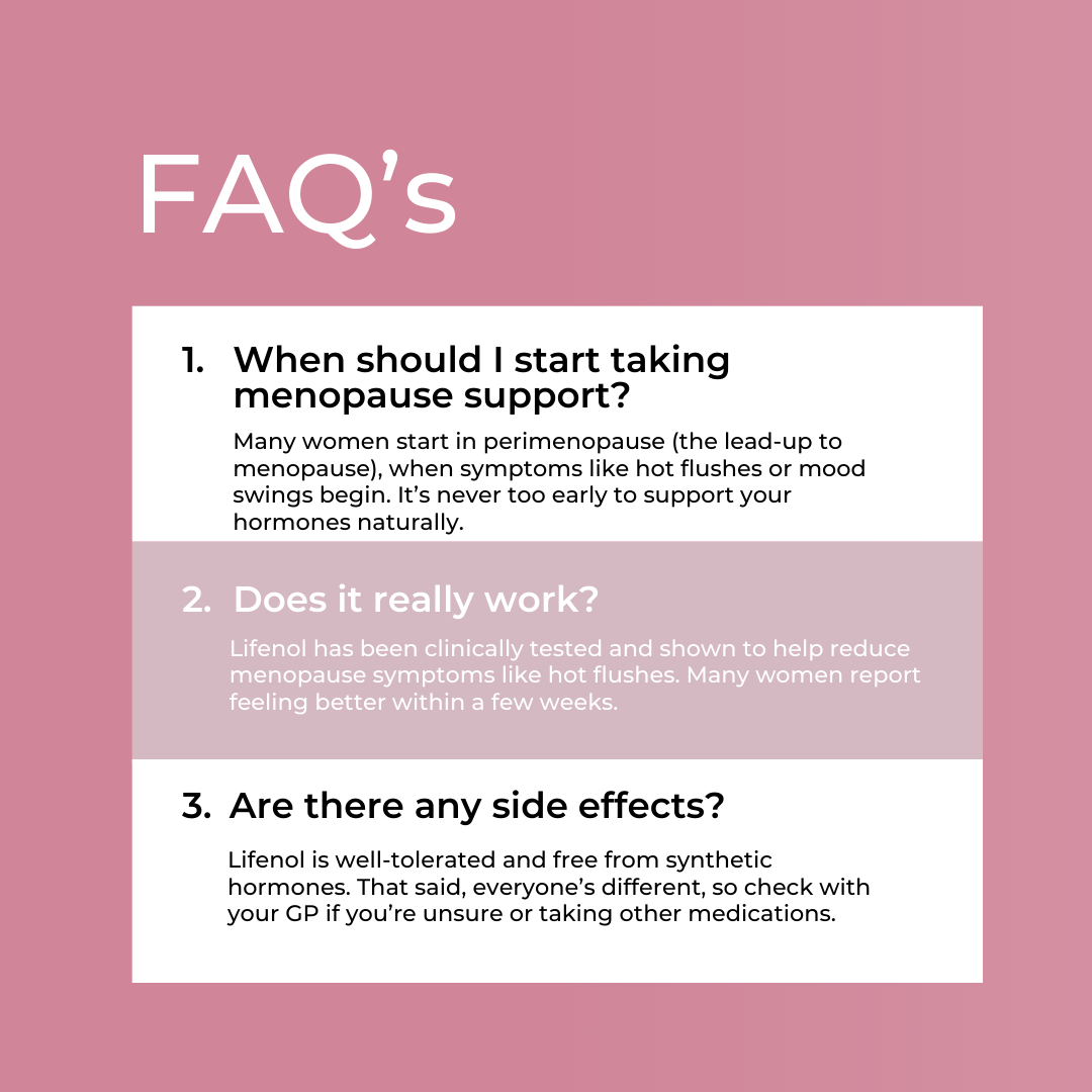 Lifenol has been clinically tested and shown to help reduce menopause symptoms like hot flushes. Many women report feeling better within a few weeks.